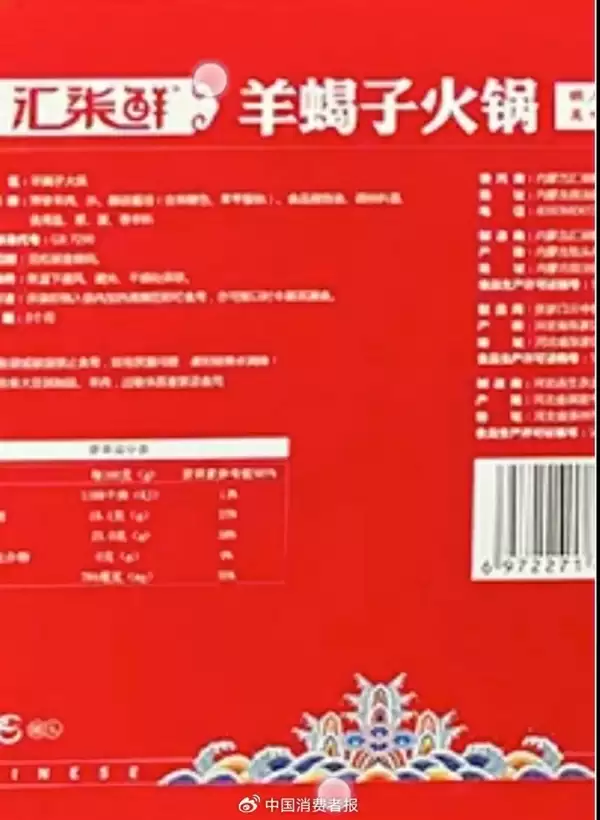 8月12日19时14分,“高途佳品”直播间销售“汇柒鲜羊蝎子火锅”,详情页配料表照片文字模糊难辨。媒体询问客服后,对方发来相关图片,但未注明致敏原信息,还标注“详见商品包装”。