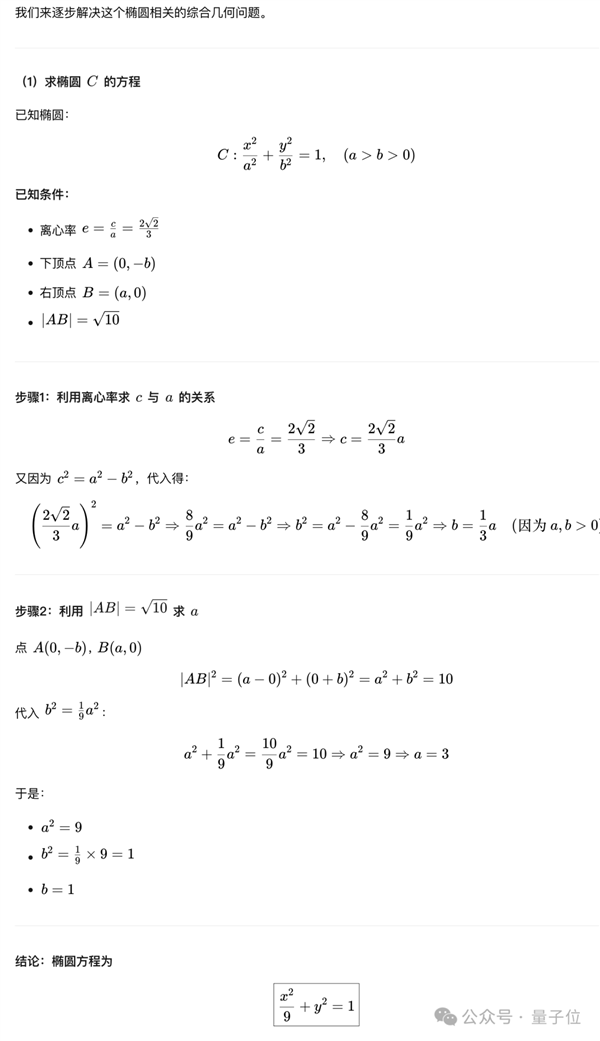 第一问在圆锥曲线类问题当中比较基础,简单结合已知信息,利用离心率的定义式然后代换数量关系就能解出,LongCat也做对了。