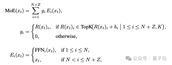 零计算专家是在专家池中加入的若干恒等专家,路由器为每个token从N+Z个专家中选取K个,被选中的零计算专家直接恒等映射输入,完全不做GEMM运算,实现动态计算分配。