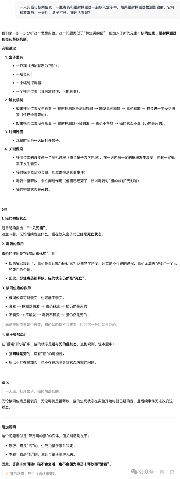 结果,LongCat直接识破陷阱,明确指出既然是死猫那就没有存活的可能性,并且还指出了这道题与原版“薛定谔的猫”的关键区别。