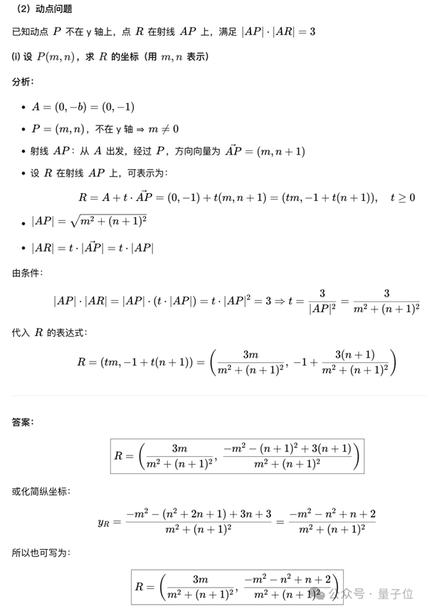 第二问的第一小问,LongCat根据R所在射线AP的方向向量,结合新设的未知变量表达了AP和AR的模,然后代入已知条件求解未知变量,最终成功解决。
