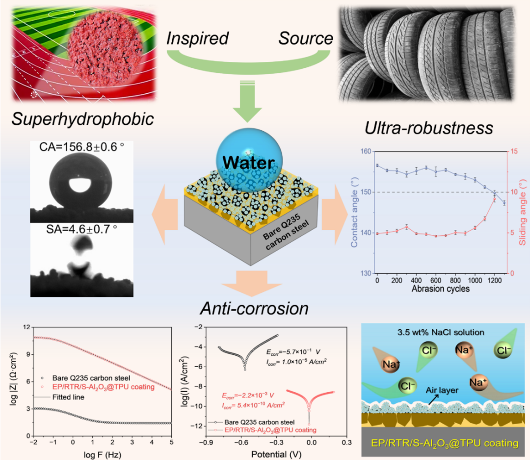 研究团队从生活中常见的橡胶跑道多层结构耐磨-耐候-缓冲特性获得灵感,以及对废旧橡胶轮胎累积带来的资源浪费、环境污染与回收再利用问题的思考,张斌斌带领的研究小组创新性地将废旧轮胎橡胶颗粒与铠甲化结构设计理念相结合,成功构建了一种三层复合超疏水防腐涂层,实现了废物高值化利用与高性能超疏水防腐涂层的“双赢”设计。