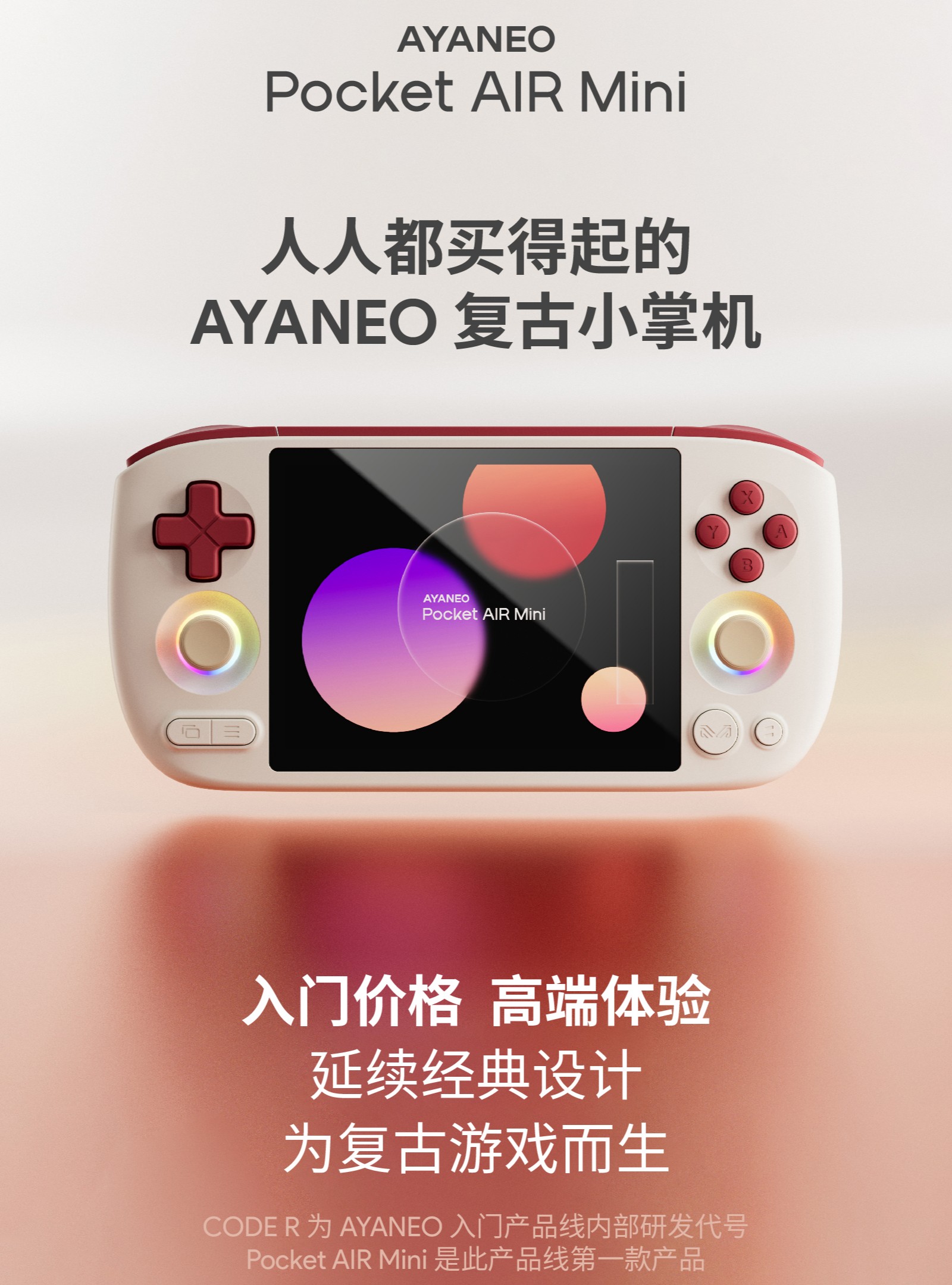 9 月 2 日消息,AYANEO 今日正式确认了其 "CODE R" 入门级产品线的首款产品 Pocket AIR Mini 复古小掌机。该型号宣称“人人都买得起”,定位性价比级。