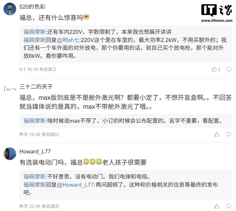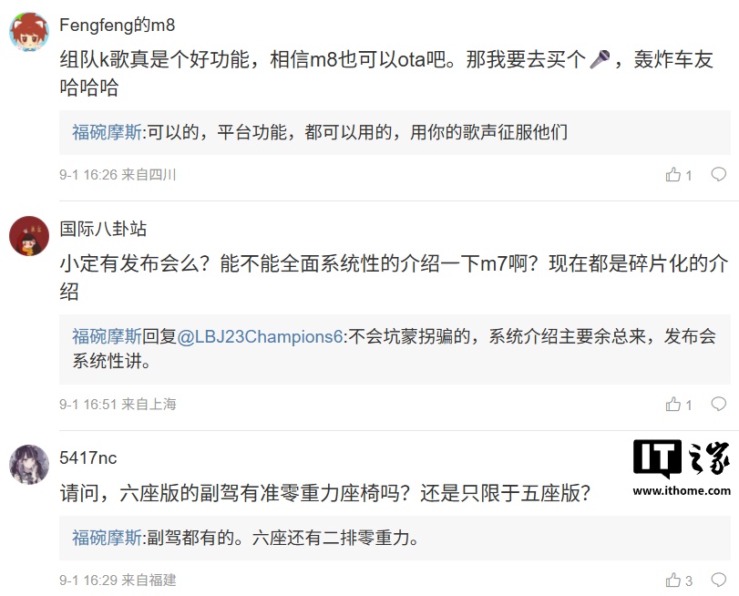 问界 M7 产品经理 @福碗摩斯 还在评论区补充了更多产品信息:针对问界 M8 汽车能否 OTA 支持“组队 K 歌”功能,他表示“可以的,平台功能,都可以用的”;针对六座版的副驾是否配备准零重力座椅,他回复称“副驾都有的。六座还有二排零重力”。此外,新车还支持车内 220V 供电,最大功率 2.2kW。
