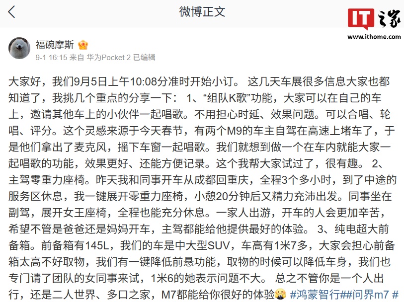 注意到,问界 M7 产品经理 @福碗摩斯 昨日分享了部分新车信息: