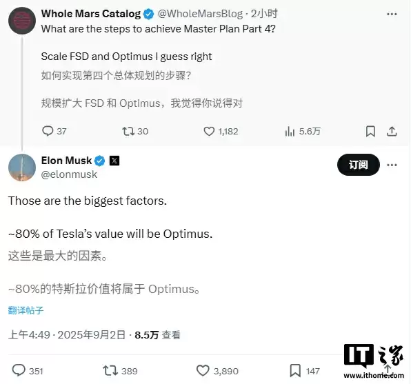 马斯克今天在回复 @WholeMarsBlog 时提到,他认为特斯拉 80% 届时的价值将来自于 Optimus。