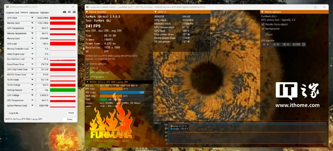 接下来是单烤 GPU,烤机过程中功耗始终保持在 175W,温度表现一如既往的优秀,无论是 GPU 核心温度还是显存温度都只有 60℃左右,GPU 频率则是 2000MHz 左右。