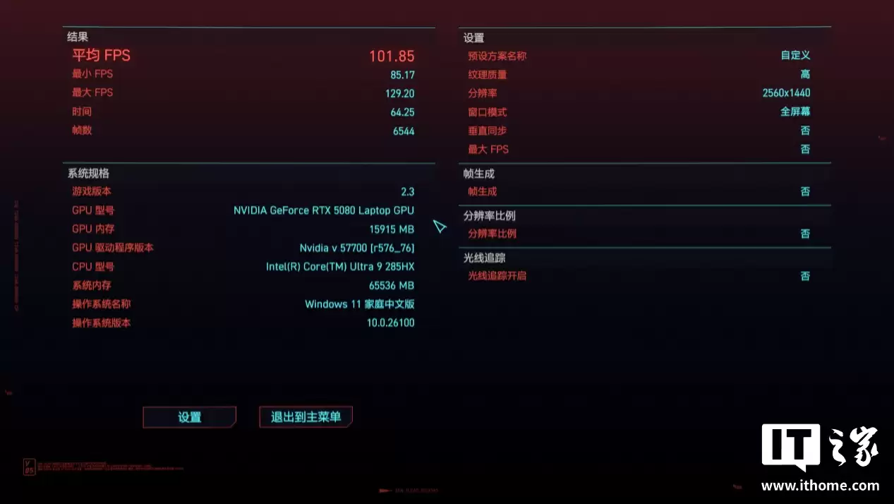 《赛博朋克:2077》对游戏本性能的挑战也非常大,即使不开启光追,只选择超级画质,4K 分辨率下游戏平均帧数也只有 46 帧,切换到 2K 分辨率后游戏平均帧数才能达到 100 帧以上。