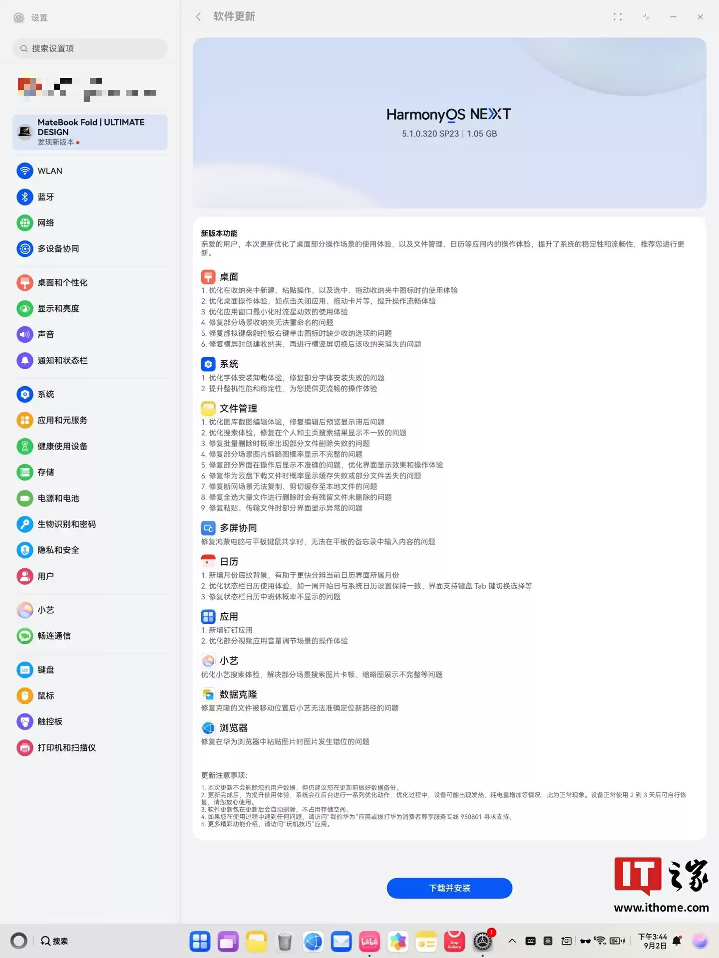 9 月 2 日消息,华为 MateBook Fold 非凡大师折叠笔记本现已开启鸿蒙 HarmonyOS 5.1.0.320 SP23 版本升级,系统包大小约 1.05GB。本次更新优化了桌面部分操作场景的使用体验,以及文件管理、日历等应用内的操作体验,提升了系统的稳定性和流畅性。