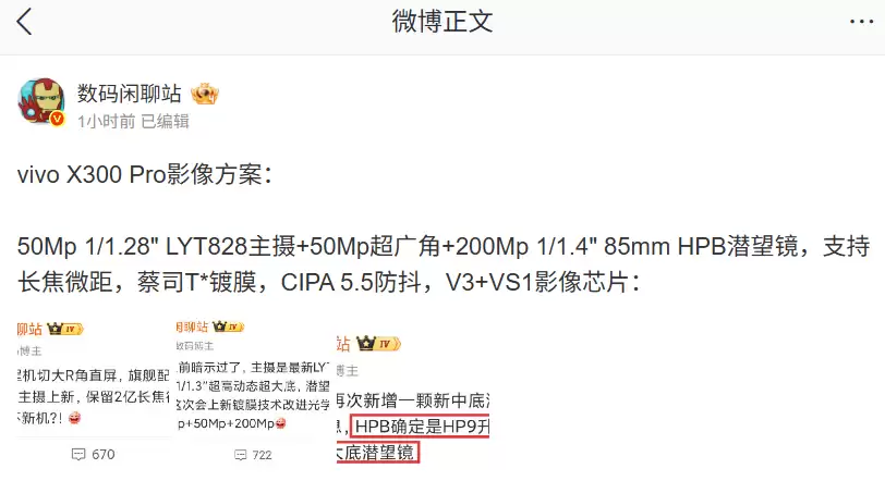 据博主 @数码闲聊站 今日爆料,vivo X300 Pro 手机将配备 50Mp 1/1.28" LYT828 主摄 + 50Mp 超广角 + 200Mp 1/1.4" 85mm HPB 潜望镜,拥有蔡司 T* 镀膜、搭载 V3+VS1 影像芯片,支持长焦微距、CIPA 5.5 防抖等。