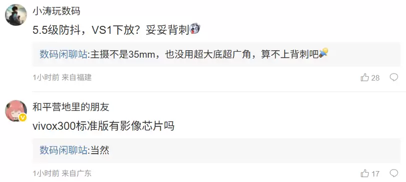 博主还在评论区补充了一些细节:针对 5.5 级防抖和 VS1 芯片下放是否属于背刺 Ultra 老机主,他表示“主摄不是 35mm,也没用超大底超广角,算不上背刺吧”;针对 vivo X300 标准版是否配备影像芯片,他回复称“当然”。