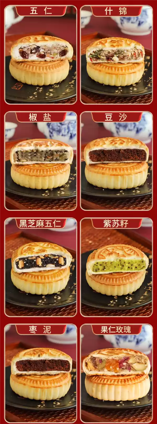 共有八种口味可选:五仁味、枣泥味、百果味、豆沙味、什锦味、紫苏籽味、玫瑰五仁味、黑芝麻五仁味。