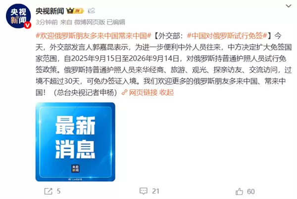 9月2日,外交部例行记者会上发言人郭嘉昆宣布了一项重要出入境政策调整。为促进国际交流便利化,中国将对俄罗斯普通护照持有者试行一年免签政策,实施时间为2025年9月15日至2026年9月14日。