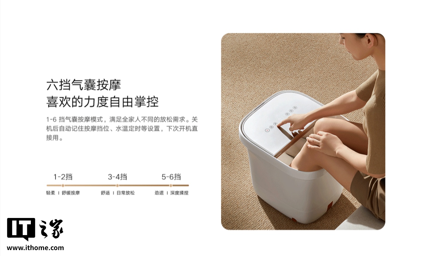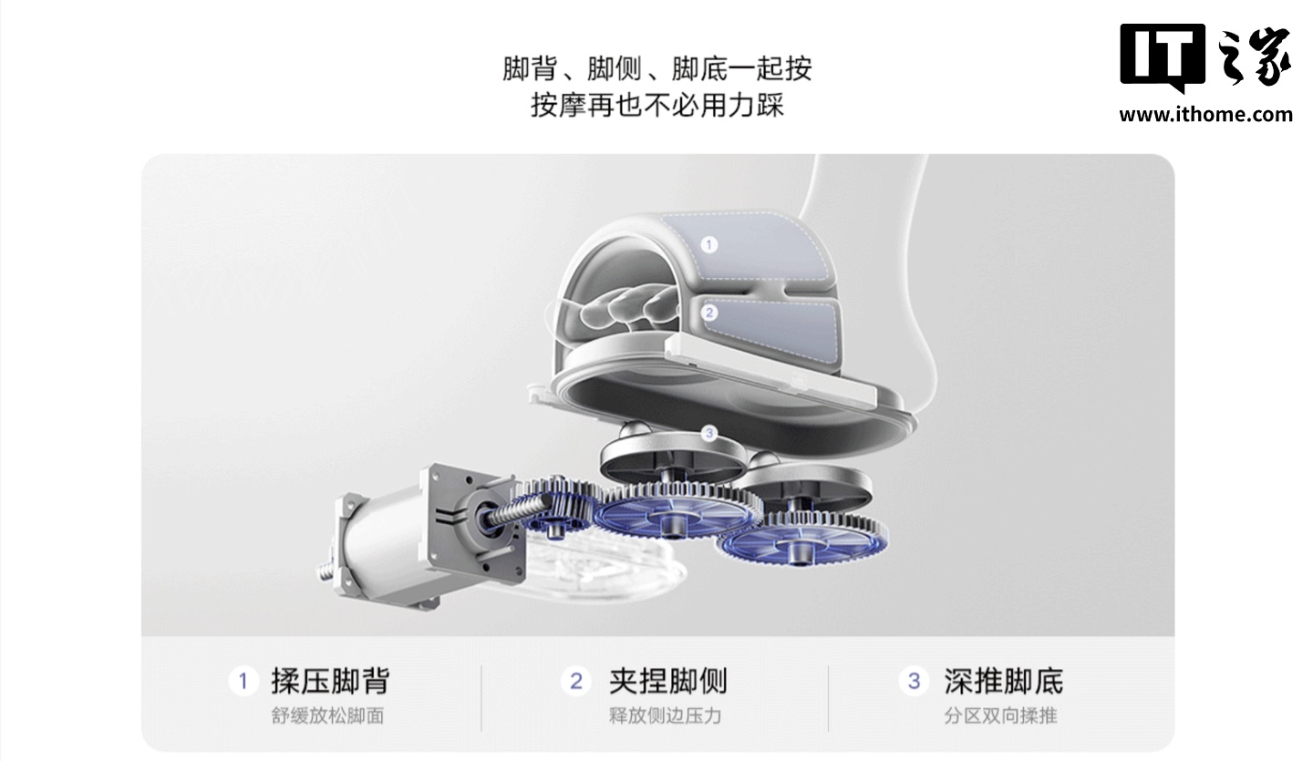 据小米介绍,这款机器内置气囊立体按摩单元,可环抱脚背和脚侧,与脚底按摩盘形成立体按摩系统,工作时可模拟“压-揉-捏-松-推”的按摩手法,并配有马达结构,可同时按摩脚背、脚侧和脚底,支持六档调节,满足不同人群的放松需求。