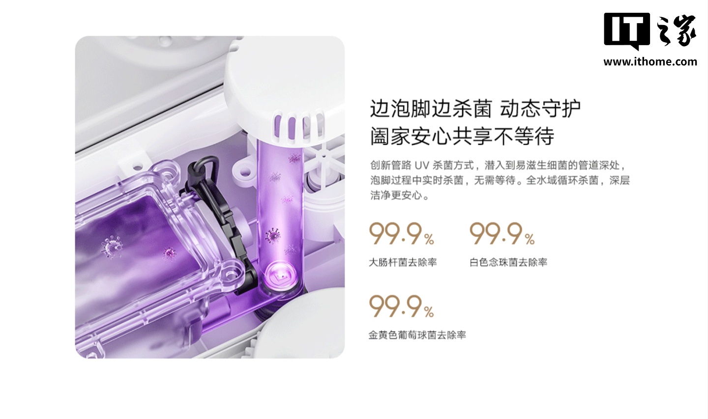 这款足浴器还搭载有管路 UV 杀菌方式,可在泡脚过程中实时杀菌,号称可去除 99.9% 的大肠杆菌、白色念珠菌、金黄色葡萄球菌,支持小米澎湃互联,可直接用“小爱同学”语音调节机器温度、按摩力度等。