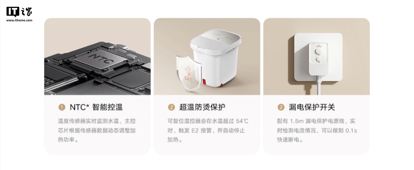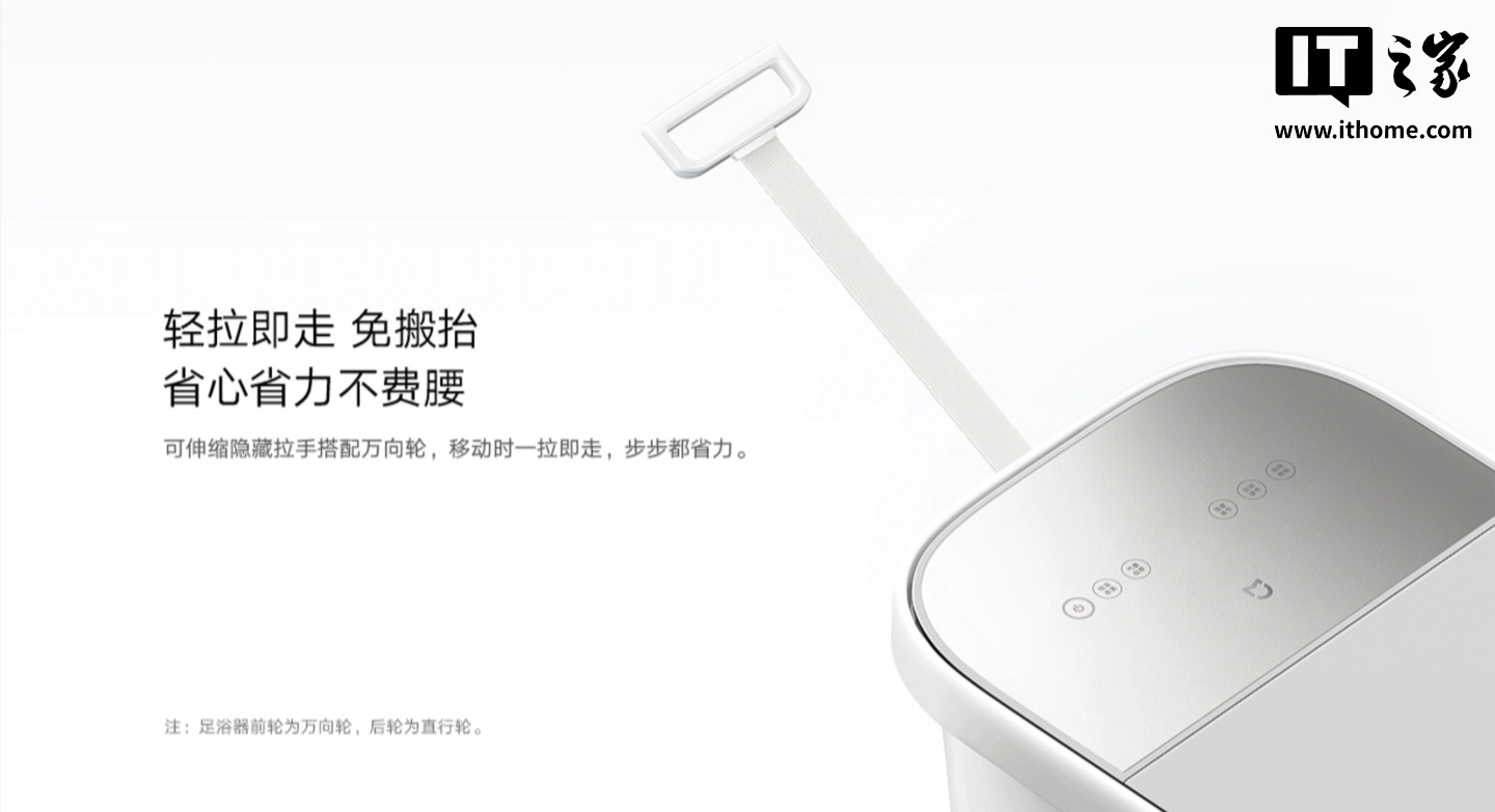 另外,这款足浴器还支持有水足浴和无水按摩,可实现“一机两用”,温度可在 35-48°C 之间调节,可定时 5-60 分钟,拥有水电分离、超温防烫保护、漏电保护开关等安全环路,机器顶部还配有伸缩拉手,搭配万向轮可实现快捷移动。