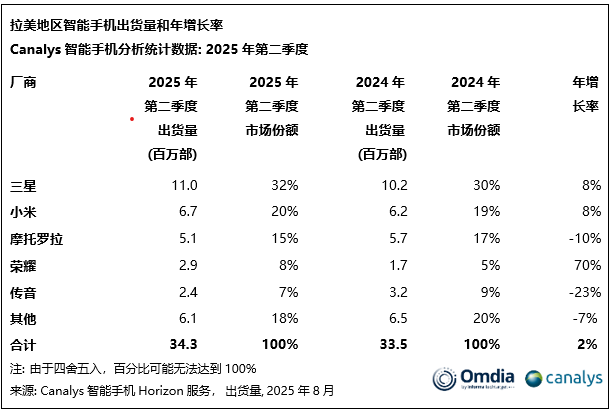 2025年Q2拉丁美洲手机市场增长2%,小米荣耀销量创新纪录