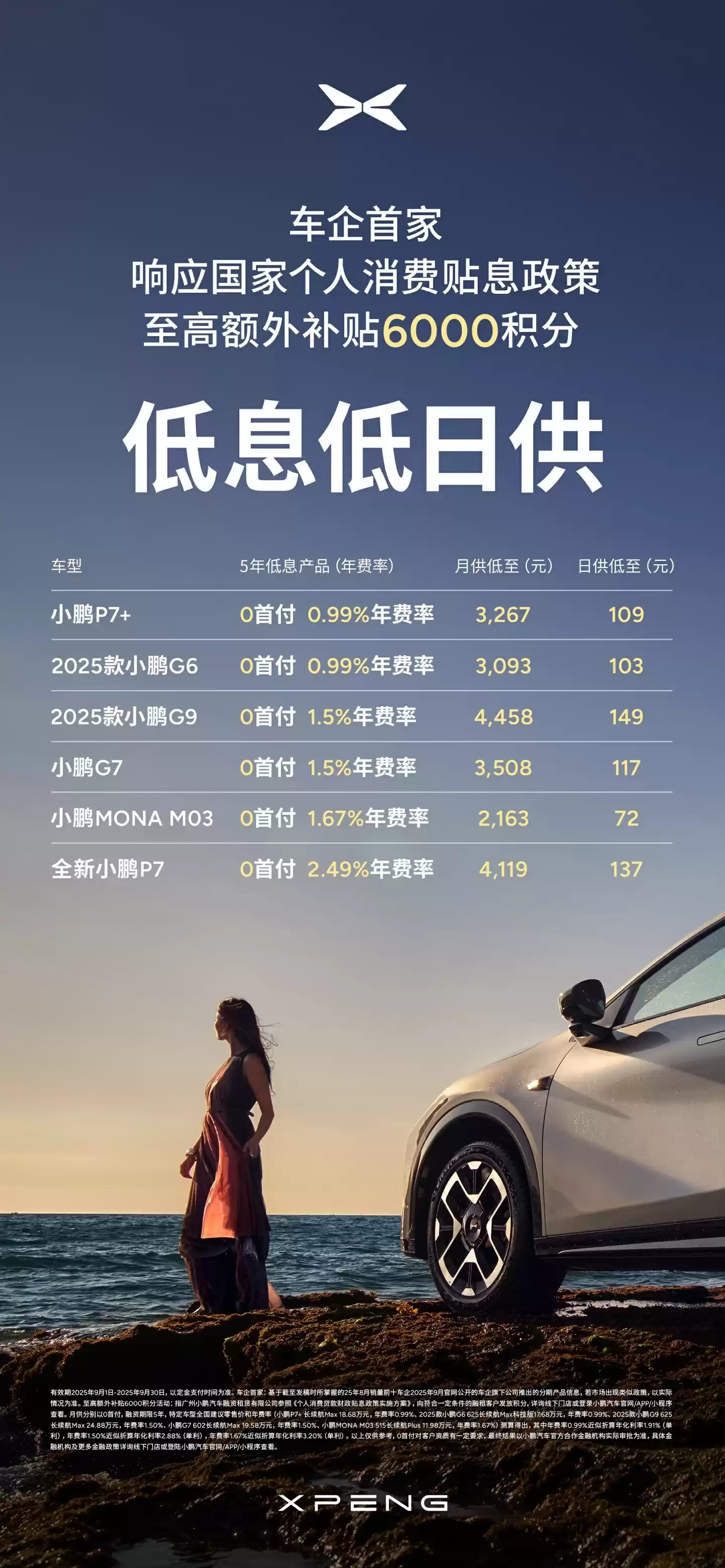 - 2025款小鹏G6:零首付+36期免息/60期0.99%低费率,最高14,800元贴息,月供3093元(日均103元)