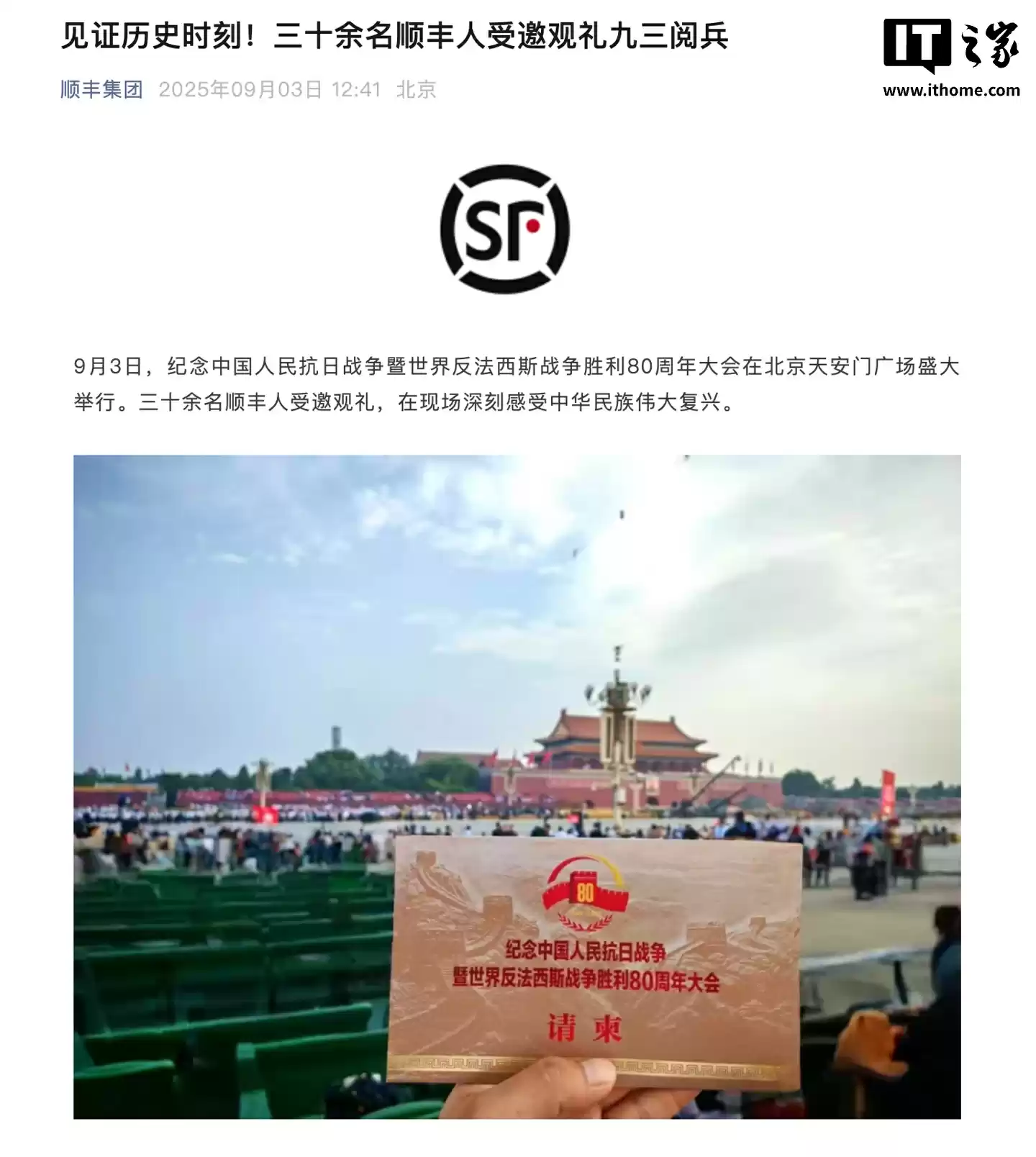 9 月 3 日消息,2025 年 9 月 3 日上午,纪念中国人民抗日战争暨世界反法西斯战争胜利 80 周年大会在北京天安门广场隆重举行。从京东、美团、顺丰方面获悉,多名快递小哥、外卖骑手受邀参加观礼。