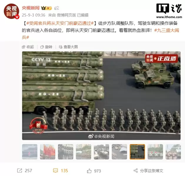 9 月 3 日消息,今天是中国人民抗日战争胜利纪念日,纪念中国人民抗日战争暨世界反法西斯战争胜利 80 周年大会将在首都天安门广场隆重举行。军事航天部队方队、网络空间部队方队、信息支援部队方队,依