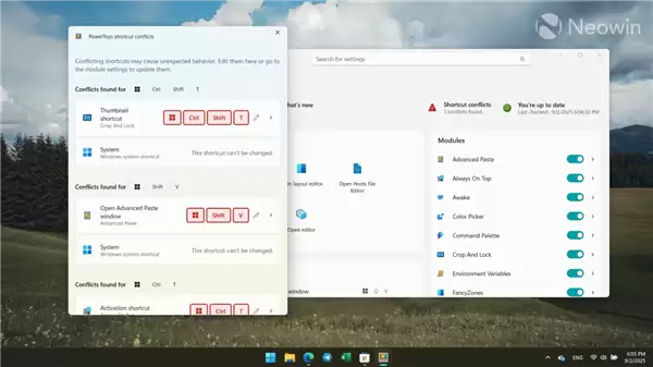 除了搜索功能外,PowerToys 0.94还引入了键盘快捷键冲突检测功能。用户可以轻松查看标准或自定义快捷键是否与现有快捷键发生冲突。