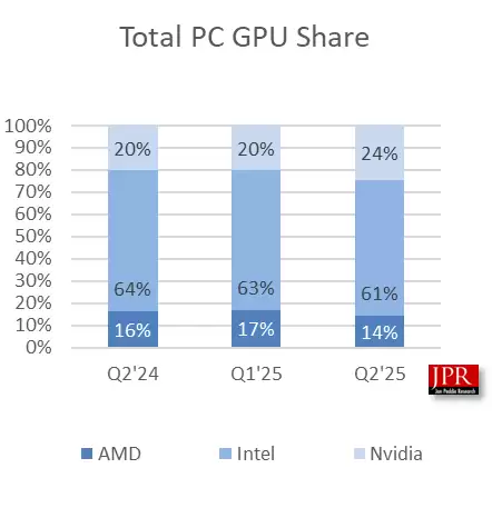 AMD变成了老三,毕竟不是所有锐龙处理器都自带GPU,份额只有区区14%,环比下滑2.4个百分点,同比也丢了将近2个。