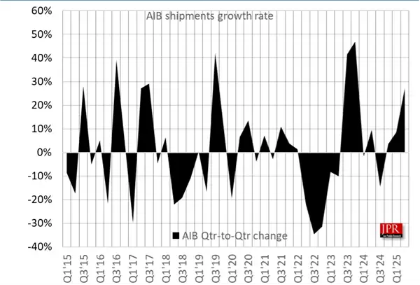根据权威机构JPR的最新报告,2025年第二季度全球独立显卡出货量1160万块,总装机量1.63亿块。