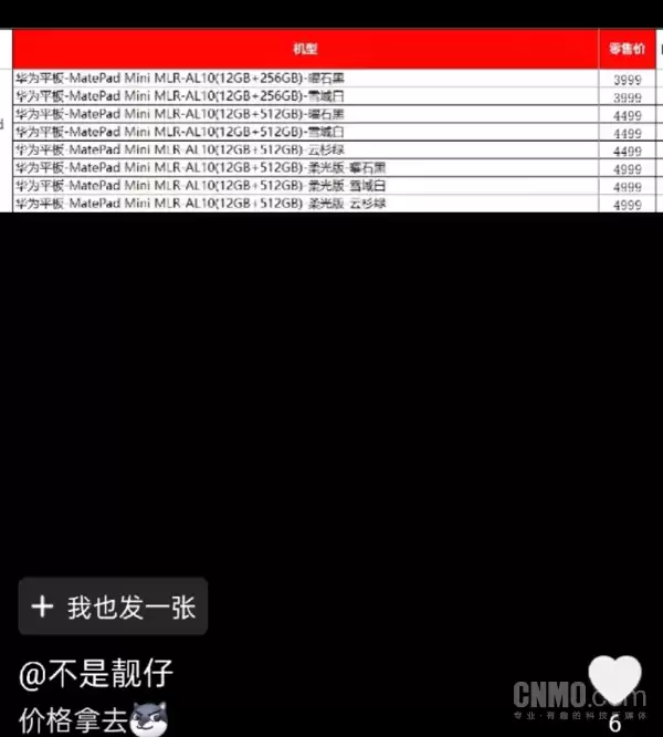 日前有数码博主提前曝光了华为MatePad Mini不同内存版本的定价情况:其中12GB+256GB版本售价为3999元;12GB+512GB版定价4499元;而12GB+512GB柔光版则售4999元。
