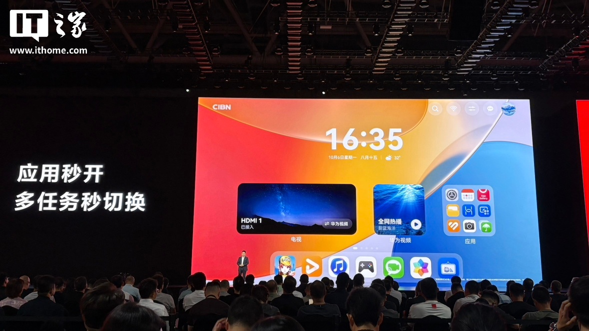 性能方面,MateTV 搭载了旗舰手机级芯片,其单核性能约为行业典型旗舰电视芯片的 6 倍,多核性能接近 10 倍,GPU 能力超 10 倍,大型应用冷启动时间仅 2 秒,同时还带来了在端侧畅玩大型手游的能力。