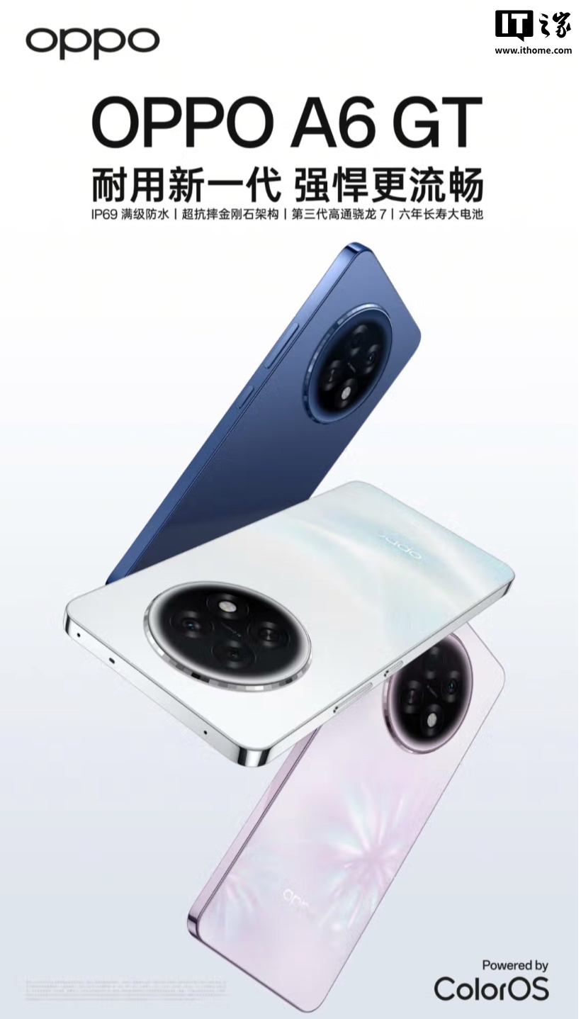 注意到,OPPO A6 GT 手机几天前刚刚上架京东等平台,其搭载骁龙 7 Gen 3 处理器,主打“7000 毫安时电池 + IP69 抗水”。