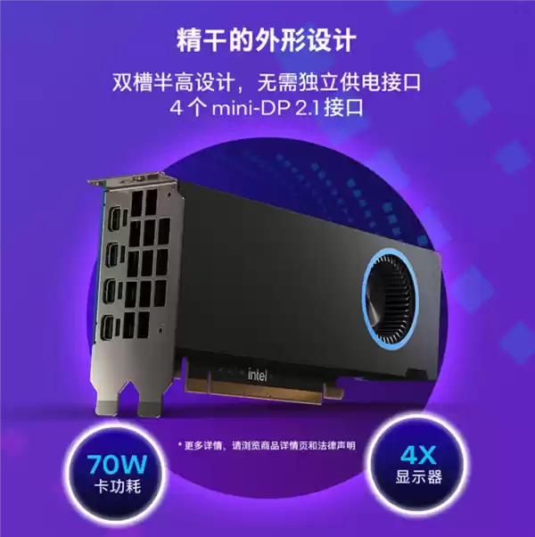 拥有16个Xe2架构核心,INT精度峰值算力170 TOPS,搭配16GB GDDR6显存,支持PCIe 5.0 x8,卡功耗70W,无需独立供电接口。