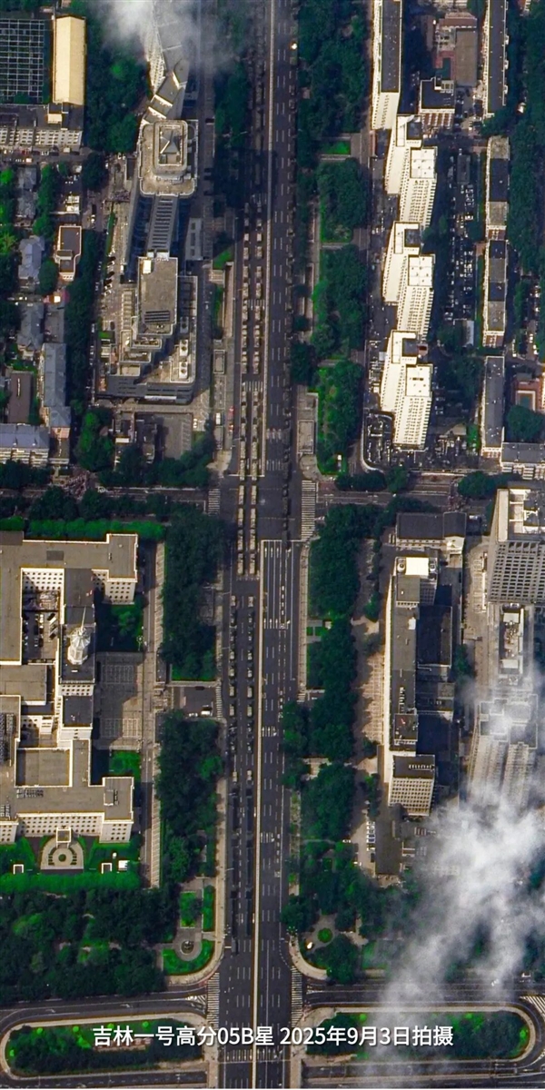 阅兵式后,长光卫星公布了吉林一号高分05B卫星拍摄的天安门和长安街,可以看到滚滚钢铁洪流正浩浩荡荡地前进!