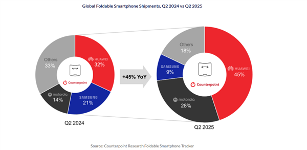 CounterPoint Research分析师表示,中国可折叠智能手机市场仍然强劲,其中华为是主要驱动力,尤其是华为MateX6,在2025年第二季度出货量占华为折叠屏手机的三分之一以上,最受消费者青睐。