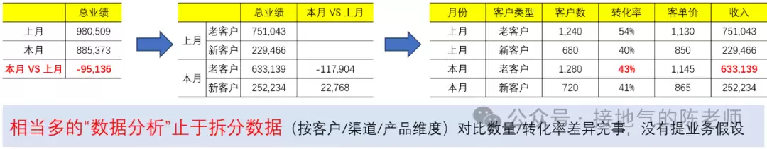 首先,分析问题时,不能只停在数字表面。比如分析“业绩下滑问题”,很多人习惯性的只看销售收入数据,把收入拆成:客户数*转化率*客单价,再按地区/客群做个拆分就算完工了(如下图)。