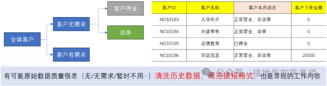 客户自己关门了!客户暂时淡季,旺季才有需求客户有需求,但对我司不满意客户没有不满意,但是我司价格太贵……这样具体的假设,能指向:解决客户投诉/调整价格/提高服务等具体动作,至少到这一层,才让数据和业务建立联系。有人会说:我的销售数据表里没这些字段,咋办!谁规定了做数据分析只能用一张表的……结合业务假设,综合利用企业各种数据,也是数据分析的职责,具体的,往下看。