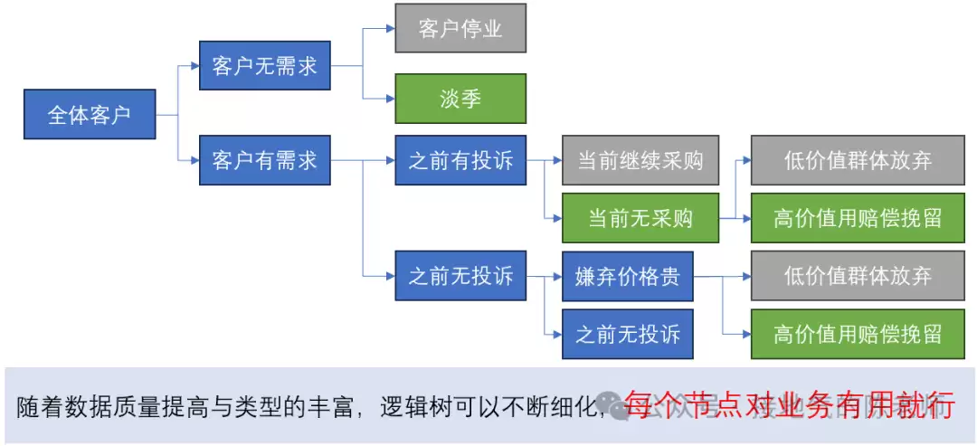 理论上,我们可以持续拆分问题,直到各类问题都有明确的业务对策。这样就实现了从数据到业务的落地。本文这里就不赘述后续拆分过程。