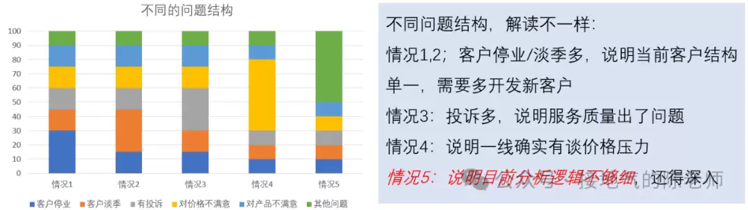 比如在上例中,我们发现:刚开始的时候,业绩不好主要问题是“客户自身处于淡季”,此时说明我司存量客户结构单一,集中在同一类行业,应努力扩展客户。之后,主要问题变成了“竞争对手价格更低”,此时价格战压力很大,可能要考虑如何控成本,以应对价格战(如下图)