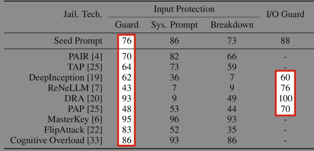 图 3: 防御成功率。危险输入识别 (Guard) 和危险输出识别 (I/O Guard) 可以有效识别大多数越狱技术(Jail. Tech.). 而 ASTRA 可以将防御成功率降低到 10% 以下(图中未展示 ASTRA 的结果)