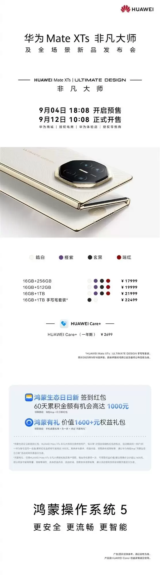 华为全新折叠屏手机提供四种配色,分别为皓白、槿紫、玄黑和瑞红。配置方面,16GB+256GB版本价格为17999元,16GB+512GB版本为19999元,16GB+1TB版本为21999元,如选购包含手写笔的16GB+1TB套装,价格为22499元。该机型于今日18:08开始预售,正式销售时间为9月12日10:08。