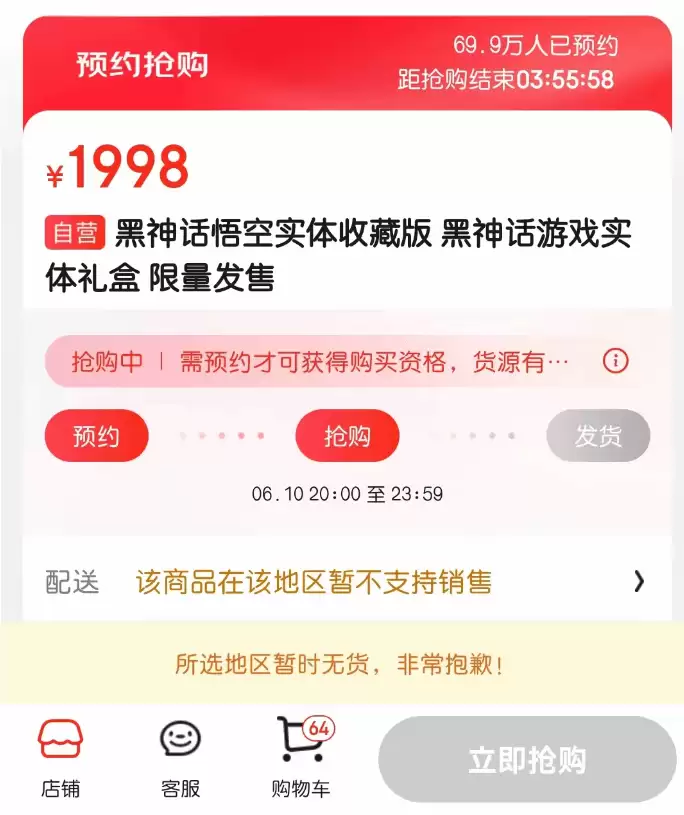 根据京东商店页面信息,《黑神话:悟空》的实体收藏版预约人数达到69.9万人,实体豪华版预约人数为35.4万人。