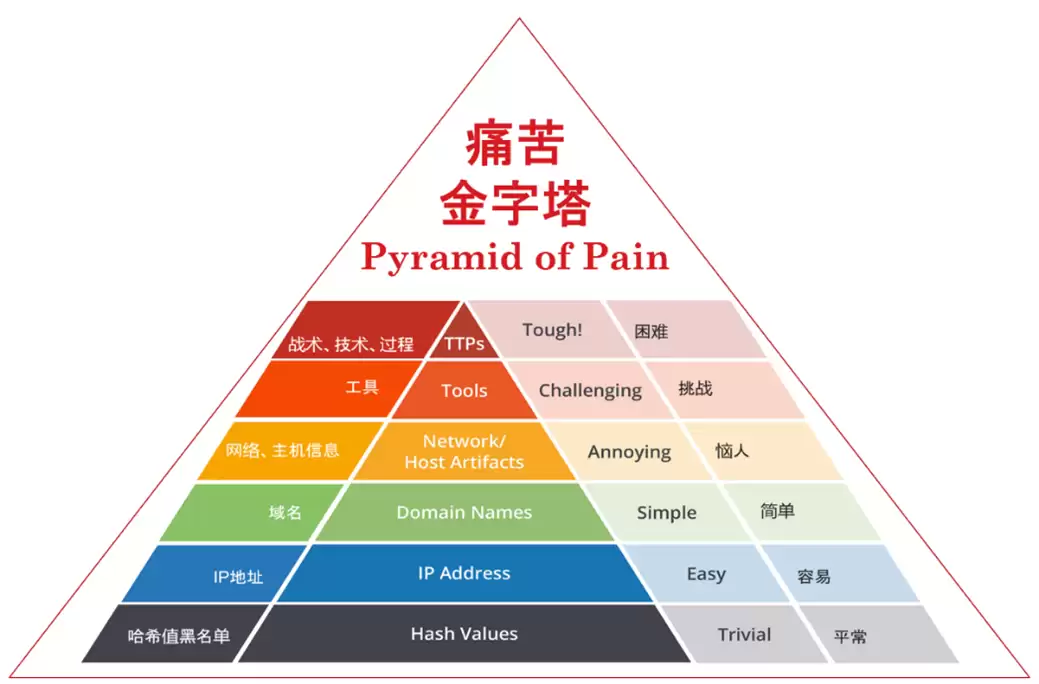 作为甲方企业,梁博对当前网络安全生态的“断层”有着深刻认知。行业内有一个经典的“威胁情报痛苦金字塔”理论(Pyramid of Pain):金字塔底层是攻击IP、域名、邮箱等,中层是攻击者使用的工具与技术,顶层是攻击者的技战术、技术、流程等,越往上层的对抗措施对攻击者的干扰越大,让甲方的防御更有主动性。