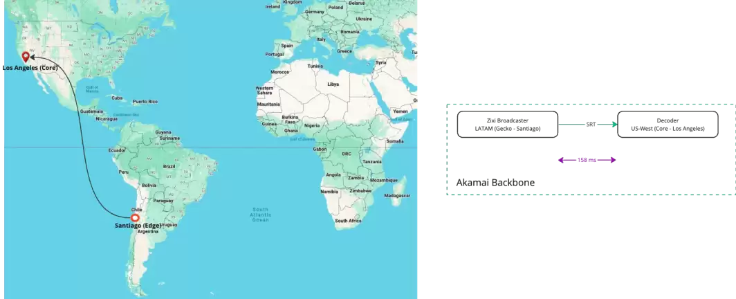 下表概述了测试期间用于评估Akamai分布式计算区域性能的不同传输路径、协议和网络。我测试了常用于视频回传的Secure Reliable Transport(SRT)和Zixi 协议。SRT通过最小化丢包和抖动优化性能,而Zixi则提供高级纠错和带宽管理功能。这些协议均在Akamai分布式计算区域上通过Akamai网络进行传输评估。
