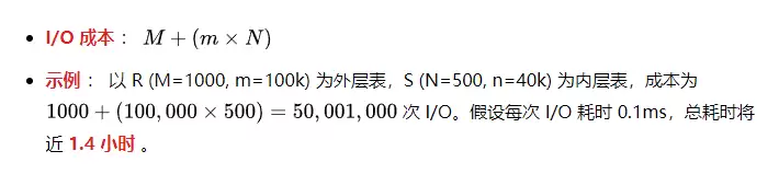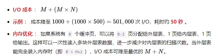 对于块嵌套循环连接(Block Nested Loop Join),其 I/O 成本公式为:外层表 I/O + (外层表块数 × 内层表 I/O)。