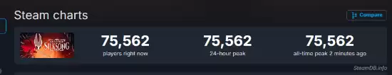 随着发售消息的公布,大量玩家涌入商店页面,一度造成访问压力过大。数据显示,游戏刚上线时的同时在线人数迅速突破前作最高纪录(72,916人),达到75,562人,增长速度之快令人惊叹。