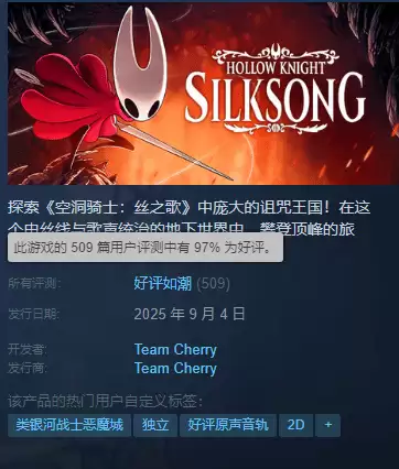 空洞骑士:丝之歌已在全平台正式上线,游戏一经推出便引发广泛关注,热度持续走高。从玩家反馈来看,作品本身的质量也足以匹配长达六年的等待时间。截至目前,在Steam平台上已有超过500条用户评测,好评率高达97%。热度数据显示,游戏同时在线人数峰值突破了111,873人。
