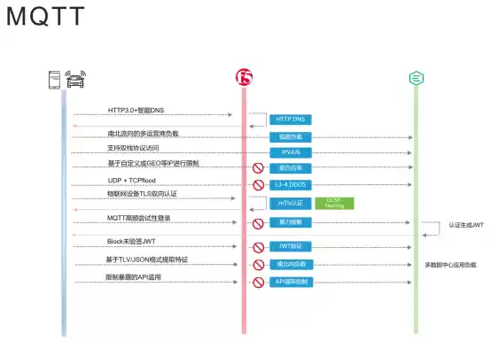 面对高并发、低延迟需求的消息时,可以通过引入代理设备实现多ISP线路负载,延迟优化,IPv4/6双栈,MQTT代理设备增加处理并发能力,降低车联网业务延迟。安全方面,可以将mtls双向认证,JWT验证,DDOS缓解等功能交给代理设备完成。