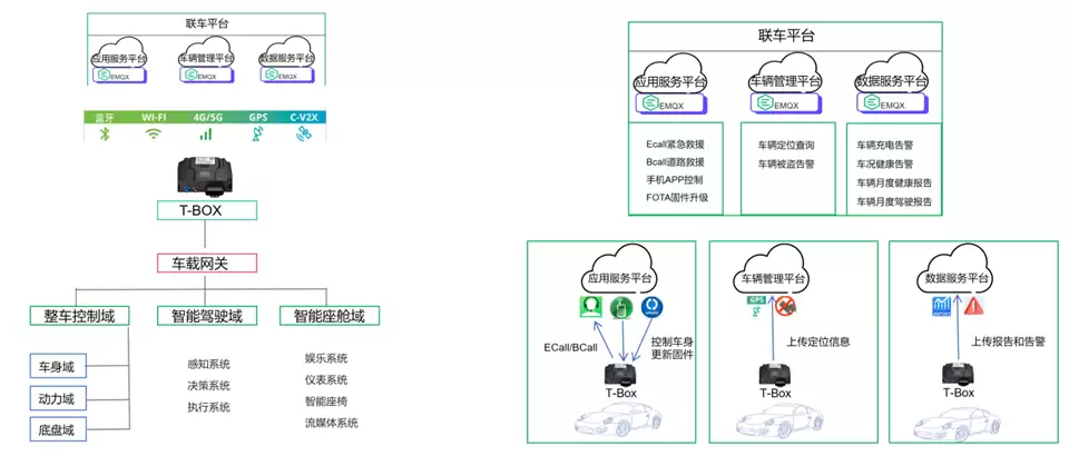 应用服务平台:其中Ecall紧急救援,Bcall道路救援主要是通过车辆中的TBox中的GPS定位芯片以及4G芯片将车辆的信息发送给车联网应用服务平台,实现及时救援。手机远程也可以通过APP,连接车联网应用服务平台,实现遥控车辆的车身系统BCM,实现远程控制车窗,座椅,空调,解锁等功能。应用服务平台还可以通过云端对TBox进行远程OTA固件升级。车辆管理平台:通过车辆TBox的GPS定位,利用MQTT长连接,可以自动实时通知车辆管理平台上传定位信息,实现防盗报警。数据服务平台:通过TBox采集车辆信息,将车辆的充电,健康状态,车辆驾驶信息等做成月度报告定期上传给数据服务平台。