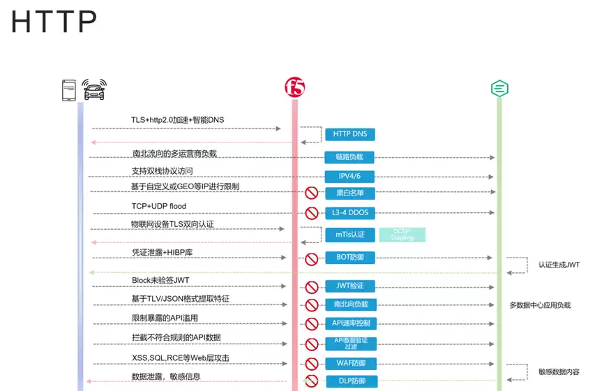 数据特征提取:基于 TLV/JSON 格式提取特征 ,用于识别和分析数据,保障数据传输和应用交互的安全性。API 管控:限制暴露的 API 滥用,进行 API 速率控制 ,防止 API 被过度调用,保护后端应用和数据安全。在车联网复杂的应用场景中,从弱网环境,低延迟要求、安全认证到安全防护等一系列解决方案的落地实施,不可避免地会带来性能消耗与延迟问题。而将这些对性能影响较大的功能,如 SSL/TLS 加密解密、负载均衡、DDoS 攻击防护等,迁移至 F5 设备上,使其作为南北流量的增值网关,可有效化解性能瓶颈。