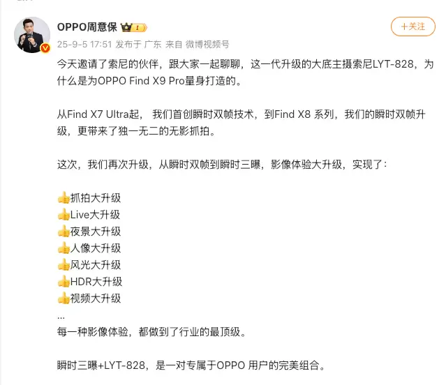 9月5日,OPPO周意保在微博上正式揭晓了Find X9 Pro影像系统的核心升级——全新定制的索尼大底主摄LYT-828。这颗传感器不仅由OPPO与索尼深度联合定制,还在算法层面进行了硬化优化,结合OPPO独家的瞬时三曝技术,带来了前所未有的影像能力提升。