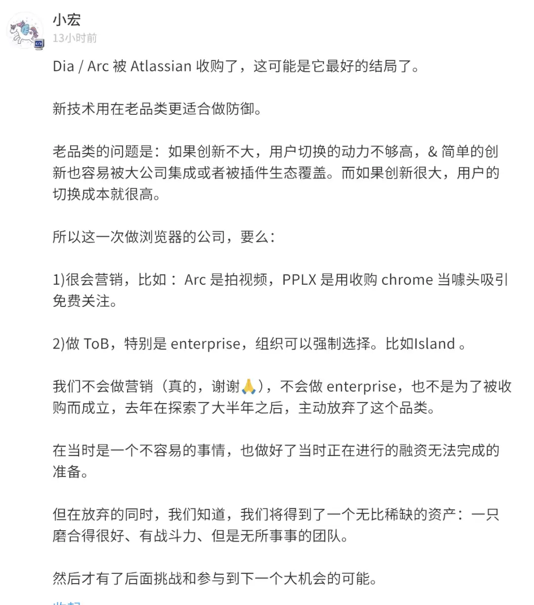 对 The Browser Company 而言,他们曾经在 Arc 上就吃到过苦头了——即使产品备受好评,但在结构性壁垒面前,创新团队很难独自突围。与其在边缘地带继续消耗,不如主动寻找能够放大价值的平台。
